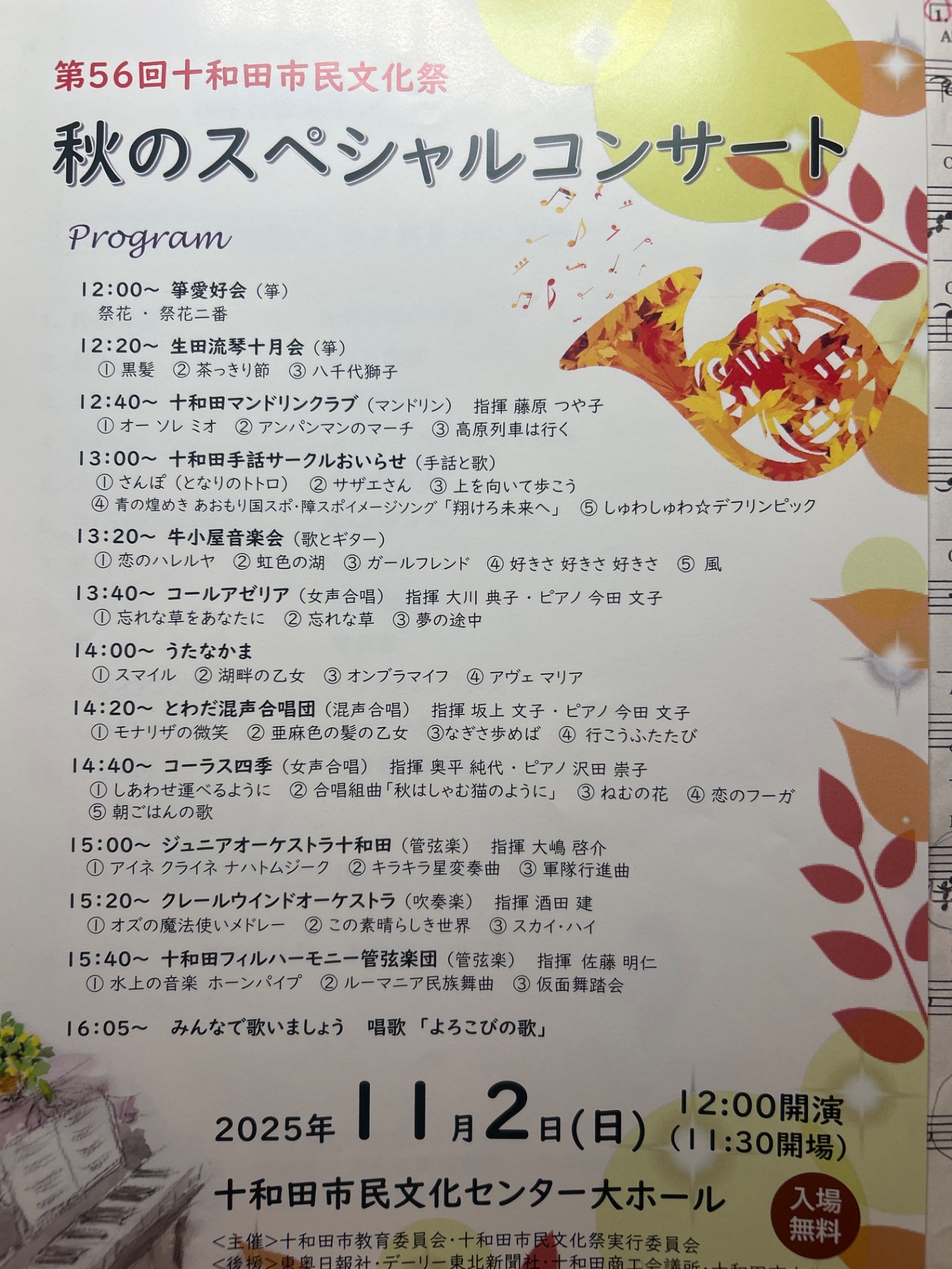 11/2(日)十和田市民文化祭のリハ。今年練習した全曲を演奏いたします。
